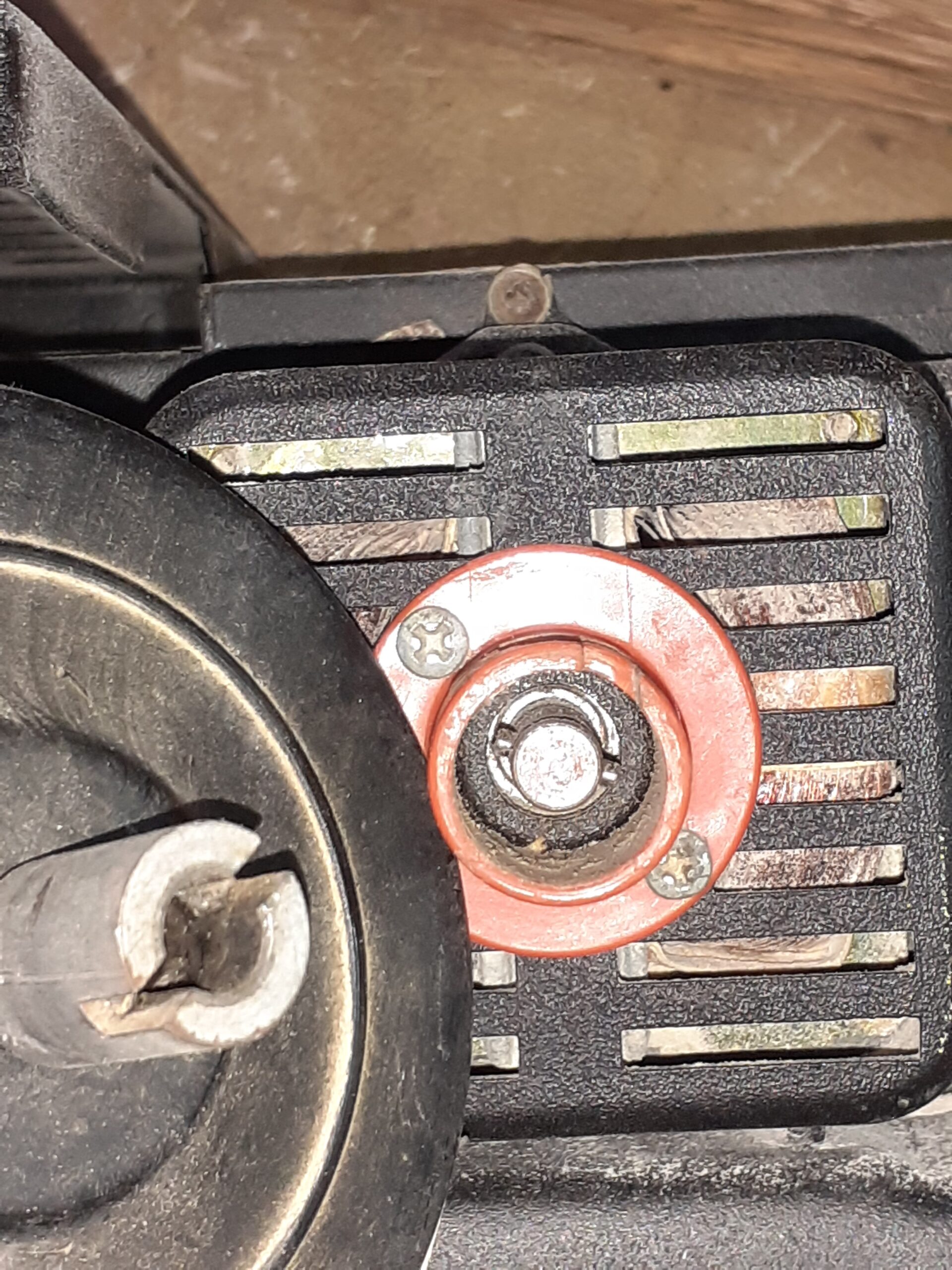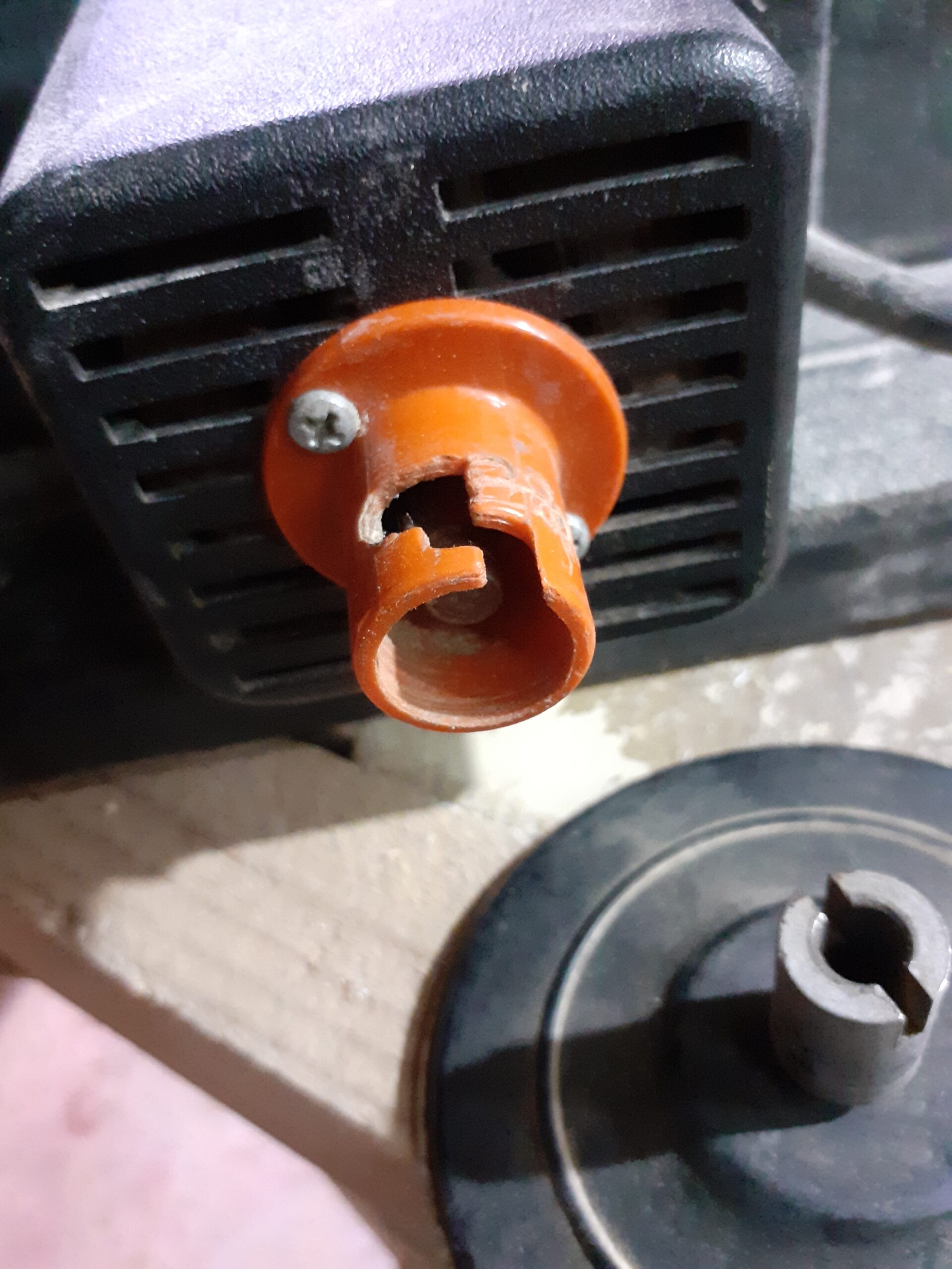 J’aurai encore besoin d’avis pour pouvoir utiliser l’axe arrière du moteur comme ponceuse. Je n’ai rien de plus que cet axe muni de sa goupille: Ni la pièce fixe, en plastique rouge (sur les photos), ni la solution d’entrainement d’un éventuel plateau ponceur. Des photos précises de ces pièces manquantes pourraient peut être me permettre de les réaliser. Si non, il me faudra trouver un mandrin adaptable que je me débrouillerai pour fixer sur cet axe